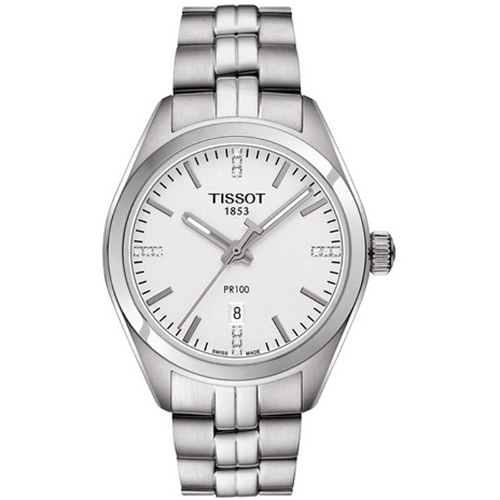 Ρολόι της σειράς Diamonds PR 100 του οίκου Tissot από ανοξείδωτο ατσάλι με ασημί καντράν σε κλασσικές γραμμές.
