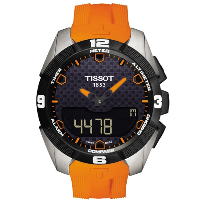 Ένα ιδιαίτερο και εντυπωσιακό ρολόι από την TISSOT από τιτάνιο με πορτοκαλί καουτσούκ και μαύρο anadigi καντράν αφής επαναφορτιζόμενο από το ηλιακό φως