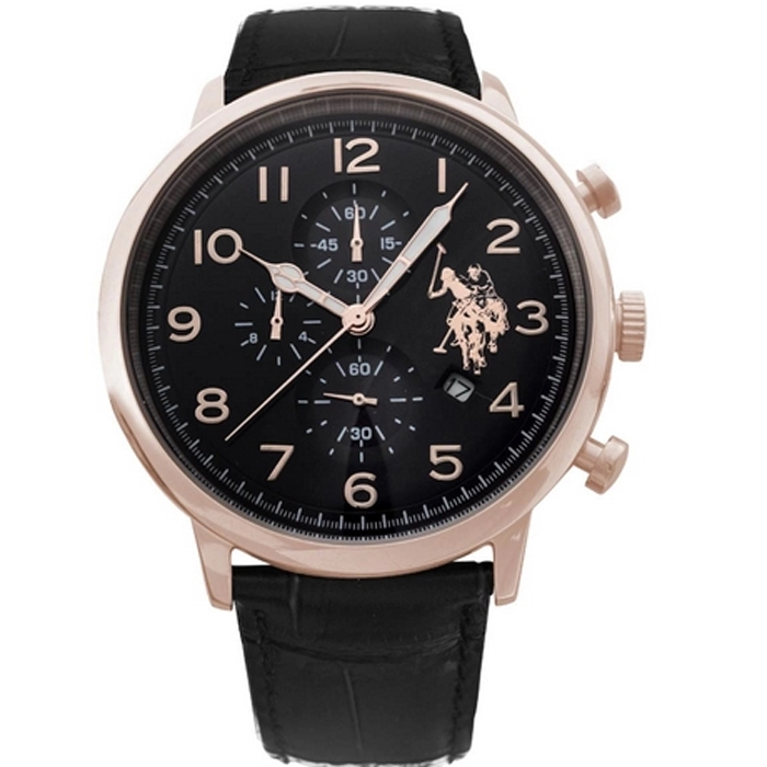 Μοντέρνο ρολόι του οίκου U.S. POLO από ροζ επιχρυσωμένο ανοξείδωτο ατσάλι και μαύρο δερμάτινο λουράκι.