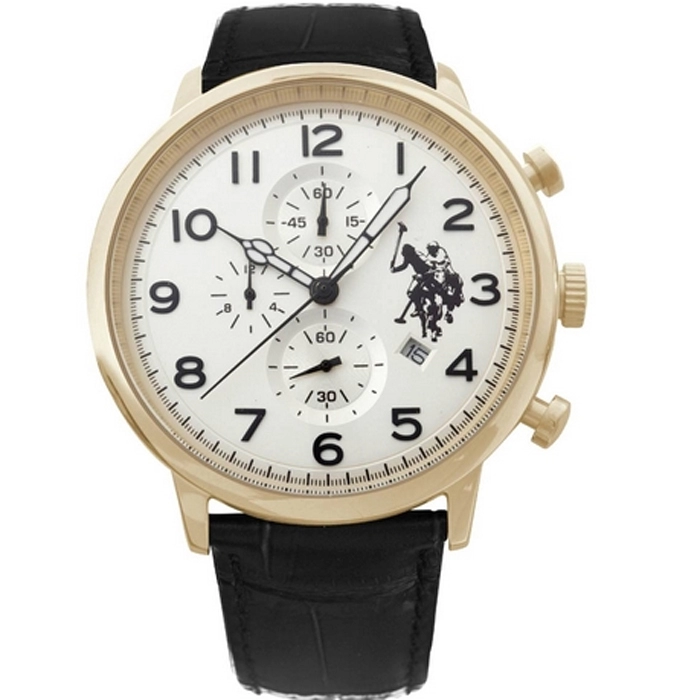 Μοντέρνο ρολόι του οίκου U.S. POLO από επιχρυσωμένο ανοξείδωτο ατσάλι και μαύρο δερμάτινο λουράκι.