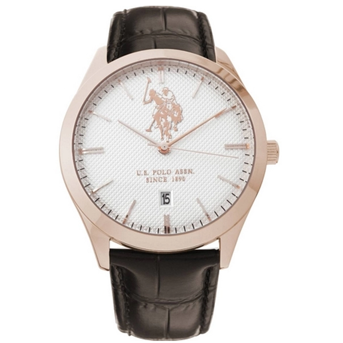 Μοντέρνο ρολόι του οίκου U.S. POLO από ροζ επιχρυσωμένο ανοξείδωτο ατσάλι και καφέ δερμάτινο λουράκ