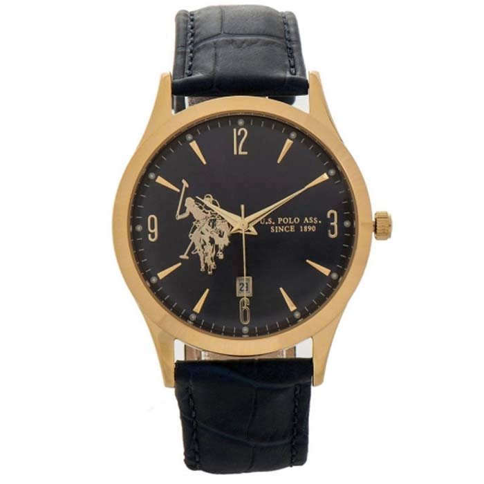 Από τον οίκο U.S. POLO ένα ρολόι από ανοξείδωτο ατσάλι, με μαύρο δερμάτινο λουράκι και μαύρο καντράν.