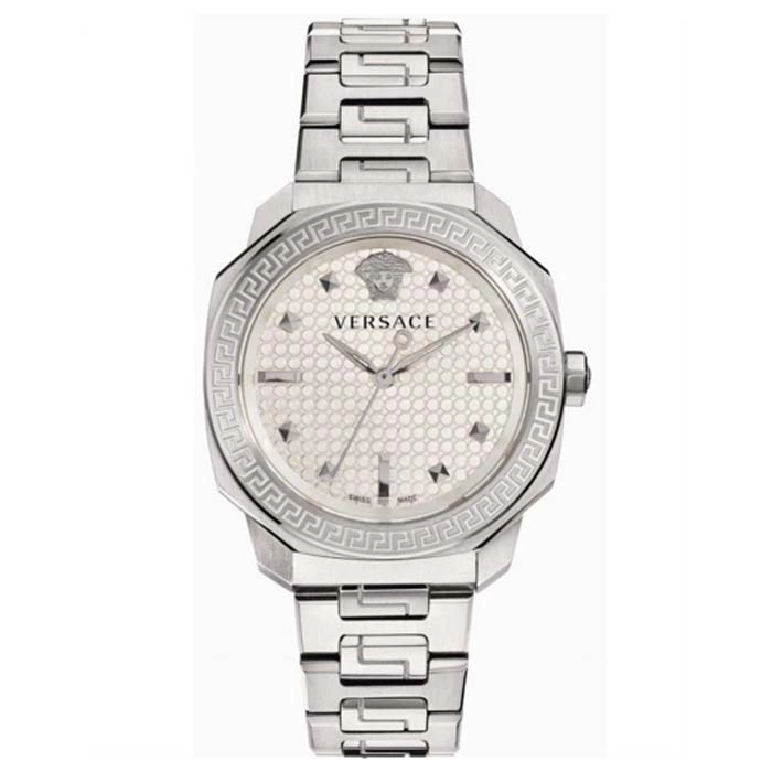 Από τον οίκο Versace της σειράς Dylos ένα ρολόι από ανοξείδωτο ατσάλι με μπεζ καντράν με ελβετικό μηχανισμό