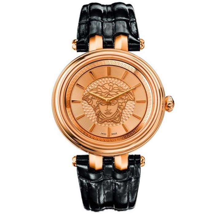 Aπό τον οίκο Versace ένα ρολόι της σειράς Khai από ροζ χρυσό ανοξείδωτο ατσάλι και μαύρο δέρμα