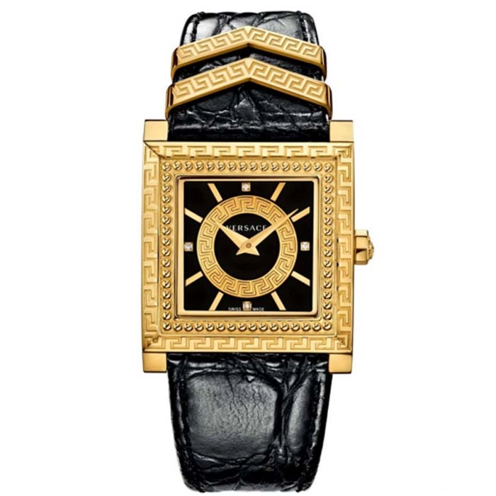 Από τον οίκο Versace της σειράς Thea ένα ρολόι από ανοξείδωτο ατσάλι, μαύρο δερμάτινο λουράκι και μαύρο καντράν με ελβετικό μηχανισμό