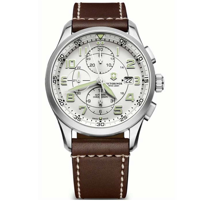Από τον οίκο VICTORINOX της σειράς Airboss ένα σπορ μοντέρνο ρολόι από ανοξείδωτο ατσάλι και καφέ δερμάτινο λουράκι με αυτόματο μηχανισμό