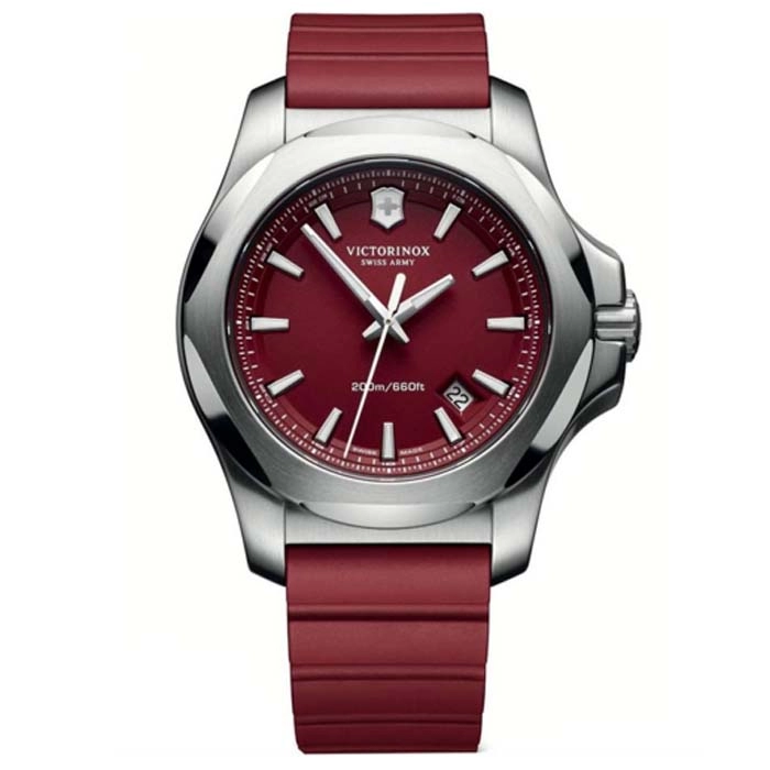 Από τον οίκο VICTORINOX της σειράς INOX για τα 130 χρονια του οίκου ένα συλλεκτικό μοντέρνο ρολόι από ανοξείδωτο ατσάλι και κόκκινο καουτσούκ λουράκι εξαιρετικής αντοχής. έχει δοκιμαστεί σε πολλά τεστ αντοχής μερικά εκ των οποίων είναι η πτώση απο 10 μέτρα ύψος, 2 ώρες σε πλυντήριο με θερμοκρασία 90 βαθμών αλλα και αντοχή ενός τάνκ 64 τόννων