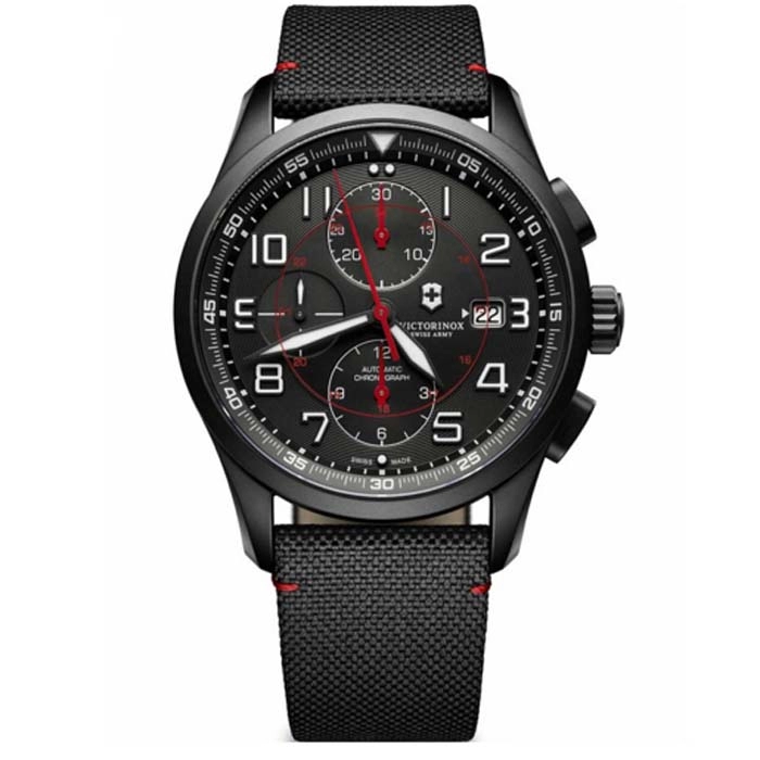 Από τον οίκο VICTORINOX της σειράς Airboss ένα σπορ μοντέρνο ρολόι από ανοξείδωτο ατσάλι με αυτόματο μηχανισμό και μαύρο υφασμάτινο λουράκι