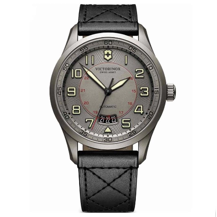 Από τον οίκο VICTORINOX της σειράς Airboss ένα σπορ μοντέρνο ρολόι από τιτάνιο και μαύρο δερμάτινο λουράκι με αυτόματο μηχανισμό σε περιορισμένο αριθμό 250 τεμαχίων πατγκσμίως