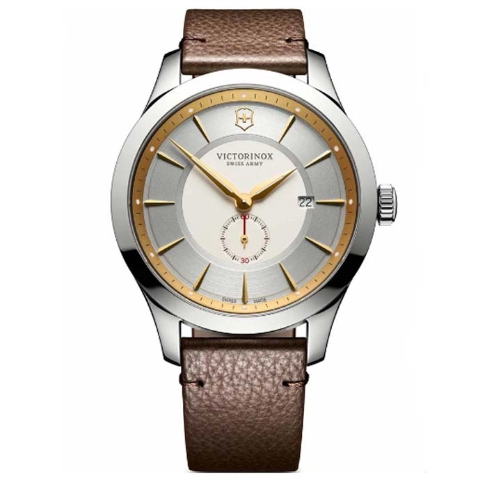 Από τον οίκο VICTORINOX της σειράς Alliance ένα μοντέρνο ρολόι με γκρι καντράν και καφέ δερμάτινο λουράκι.