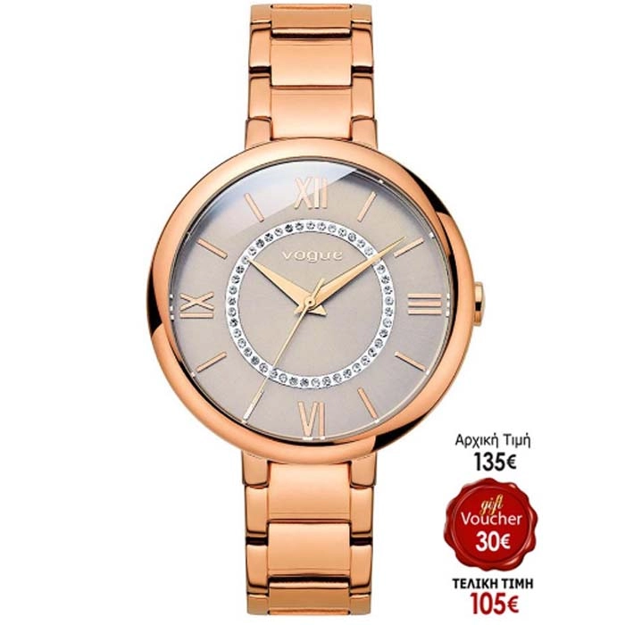 Aπό τον οίκο Vogue της σειράς Twist ένα ρολόι από ροζ επιχρυσωμένο ανοξείδωτο ατσάλι με γκρι καντράν.